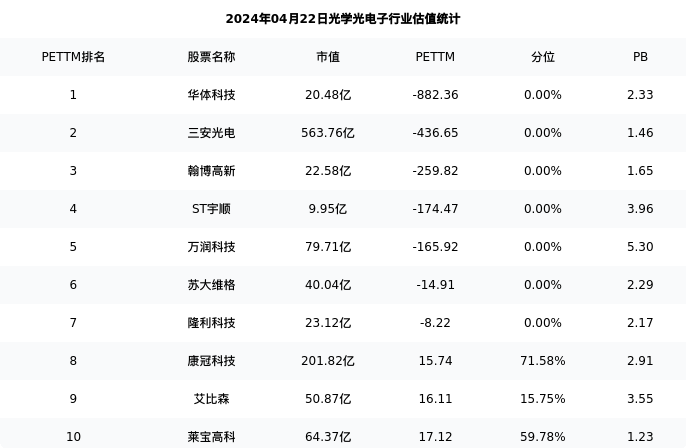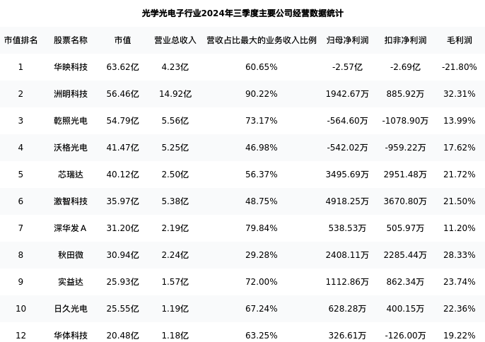 华体科技最新报告期数据为三季度,下表汇总了光学光电子行业内市值靠前的公司三季度主要经营数据