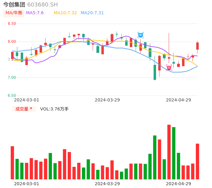 04月29日,今创集团收报7.97,股价涨幅4.87%,成交金额2960.71万元,换手率0.48%。