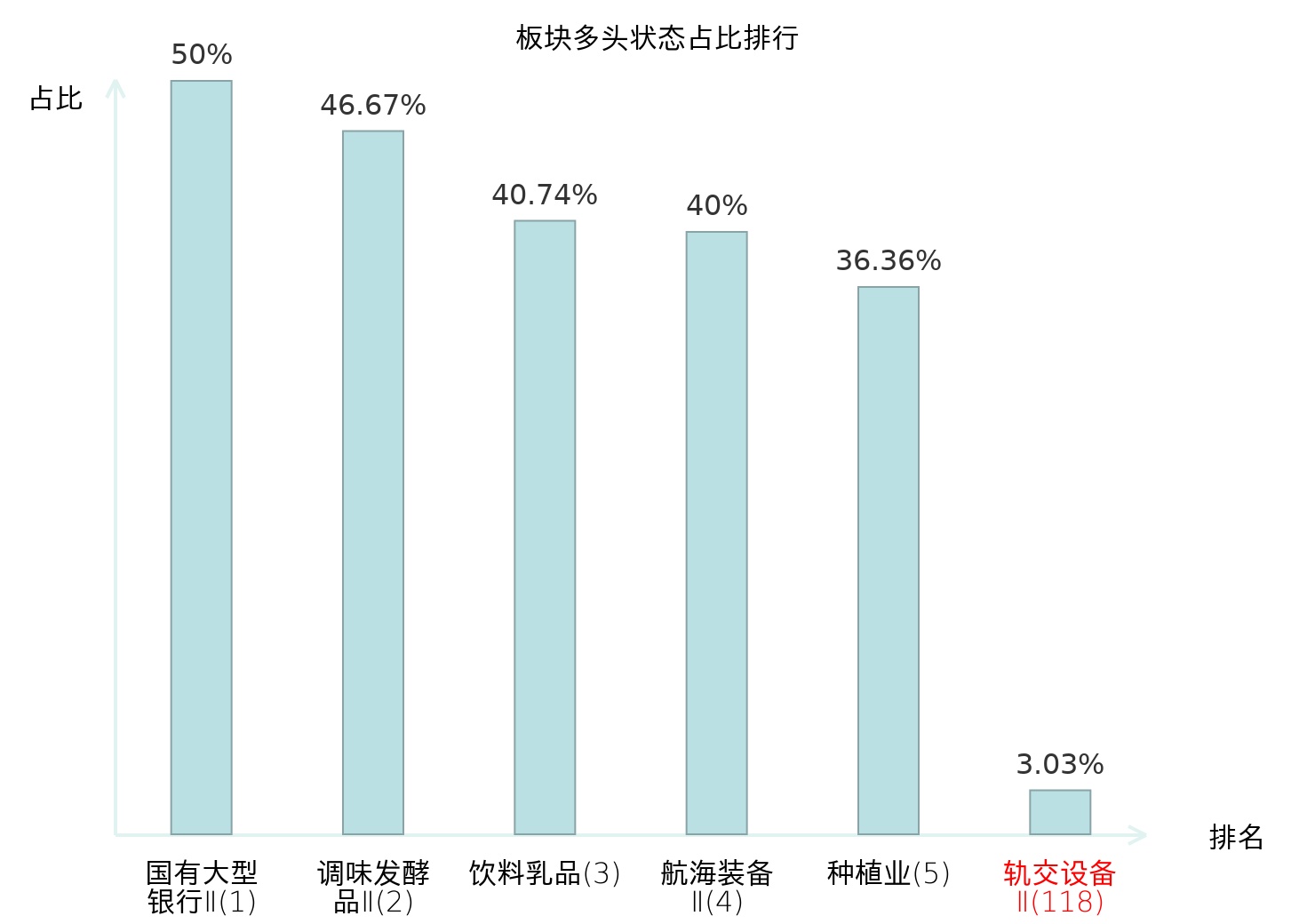 全市场所有行业板块中主力多头状态占比排名中,国有大型银行Ⅱ板块位居第一。金属新材料板块名次提升最快,较昨日上升71位。