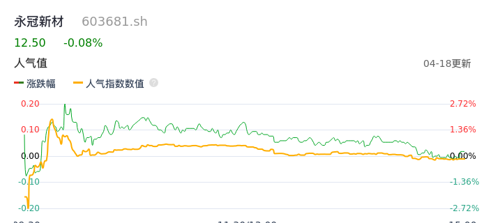 04月18日,永冠新材收报12.50,股价涨幅-0.08%,成交金额3825.47万元,换手率1.59%。