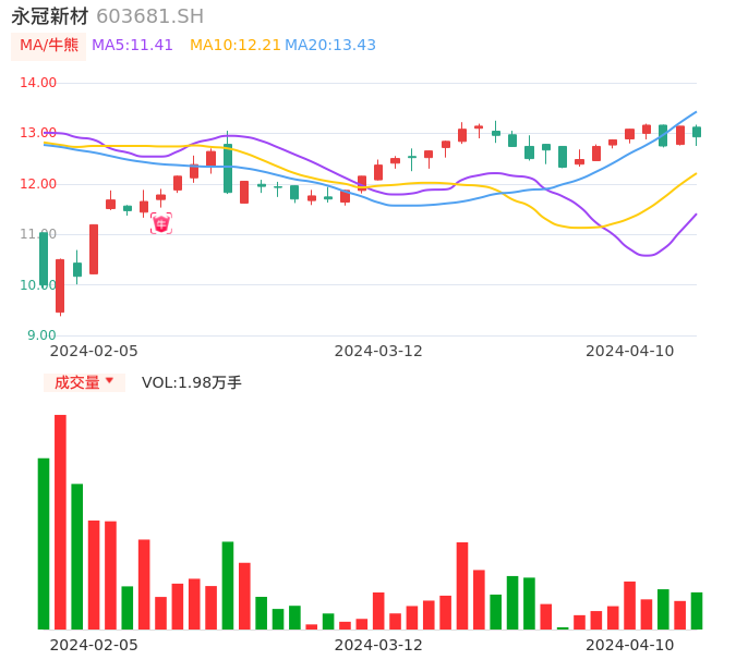 04月10日,永冠新材收报12.93,股价涨幅-1.60%,成交金额2561.01万元,换手率1.04%。