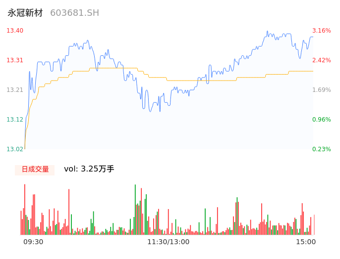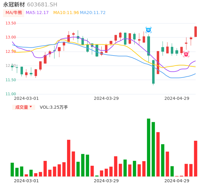 04月29日,永冠新材收报13.38,股价涨幅3.00%,成交金额4311.85万元,换手率1.70%。