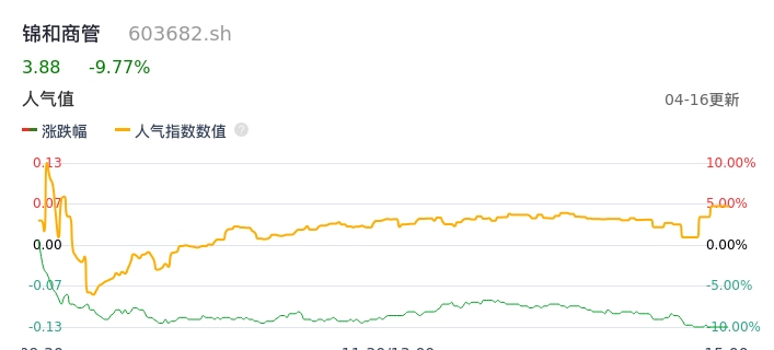 04月16日,锦和商管收报3.88,股价涨幅-9.77%,成交金额6124.39万元,换手率3.27%。