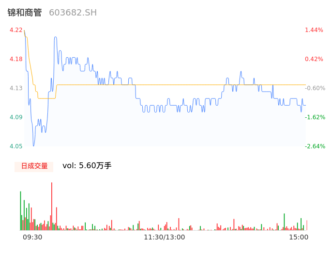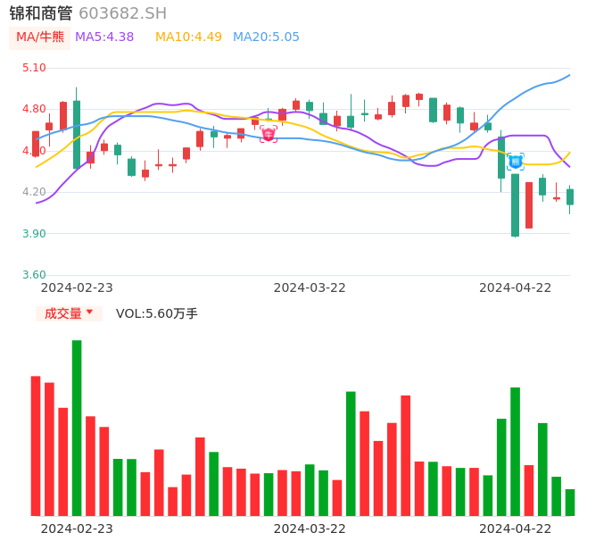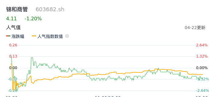 04月22日,锦和商管收报4.11,股价涨幅-1.20%,成交金额2313.91万元,换手率1.18%。