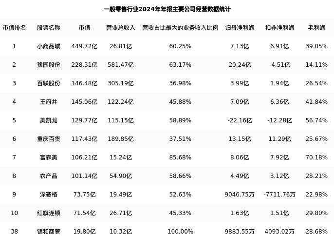 锦和商管最新报告期数据为年报,下表汇总了一般零售行业内市值靠前的公司年报主要经营数据
