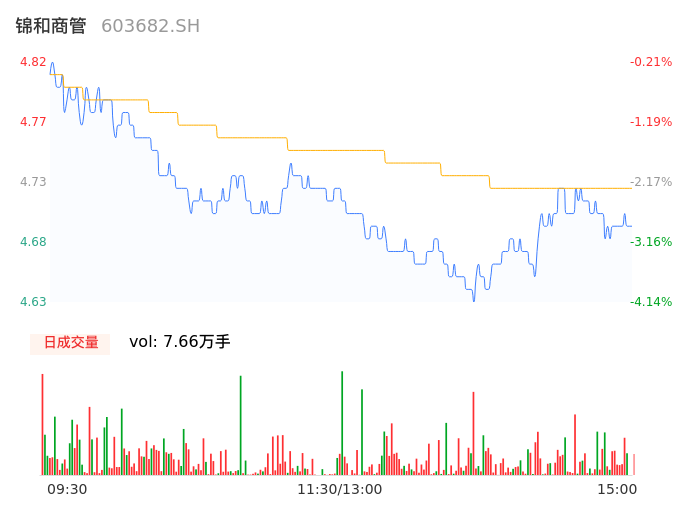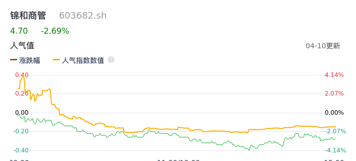 04月10日,锦和商管收报4.70,股价涨幅-2.69%,成交金额3613.87万元,换手率1.62%。