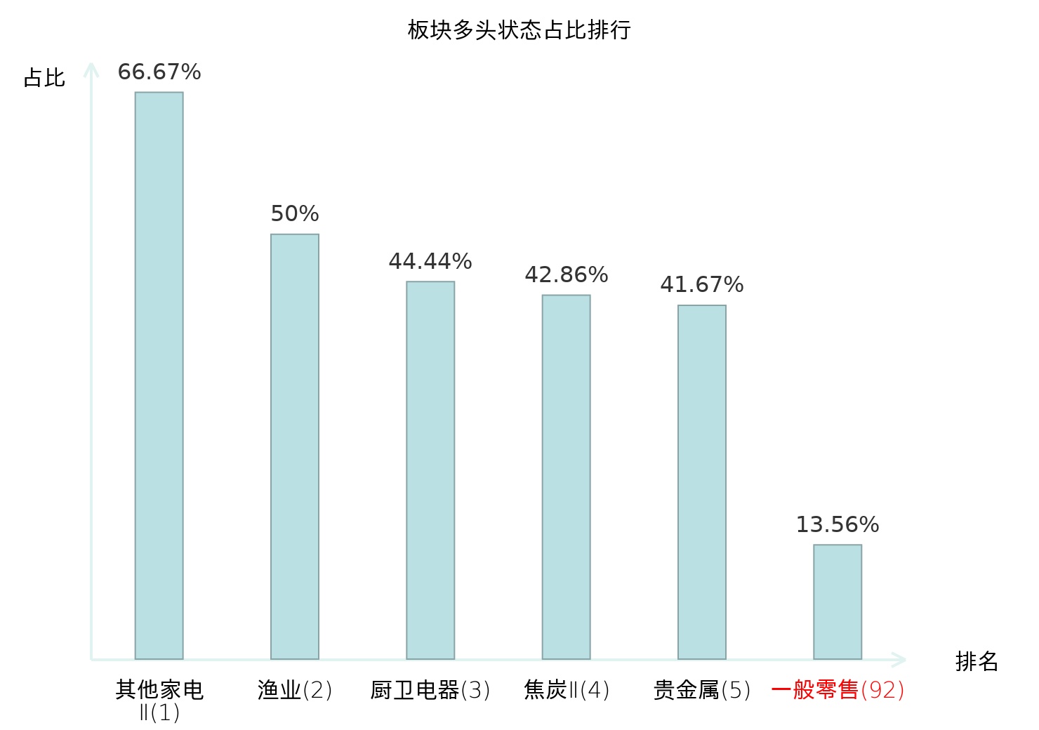 全市场所有行业板块中主力多头状态占比排名中,其他家电Ⅱ板块位居第一。乘用车板块名次提升最快,较昨日上升82位。