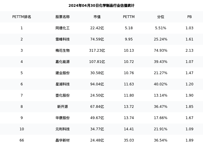晶华新材最新报告期数据为一季度,下表汇总了化学制品行业内市值靠前的公司一季度主要经营数据