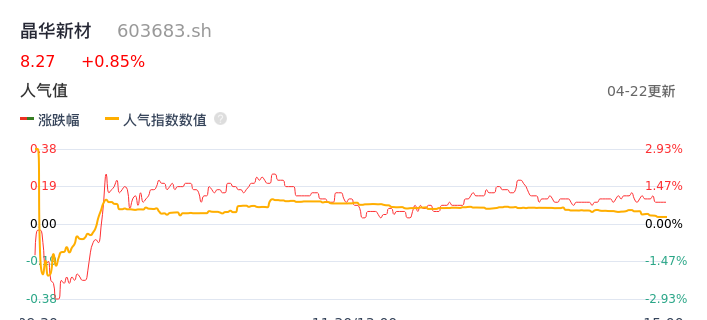 04月22日,晶华新材收报8.27,股价涨幅0.85%,成交金额2777.80万元,换手率1.31%。