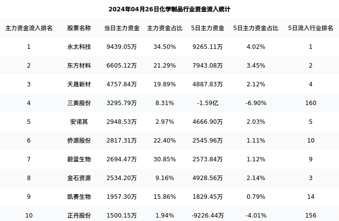 从主力资金流向来看,化学制品行业今日主力资金流入55.25亿元,在所有申万二级行业中排名:8/131。