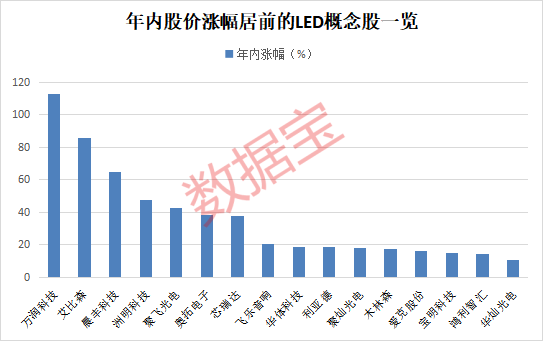 证券时报·数据宝统计,LED概念股年内股价平均上涨19.14%,整体表现强于大盘。万润科技、艾比森、晨丰科技、洲明科技、聚飞光电年内涨幅居前,均超40%。
