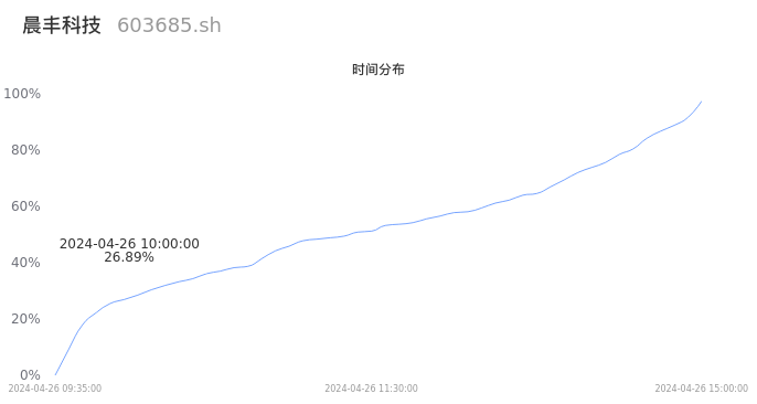 603685晨丰科技2024年04月26日成交9984手,成交金额1297.95万元,相较昨日放量165手,换手率0.59%,成交清淡。