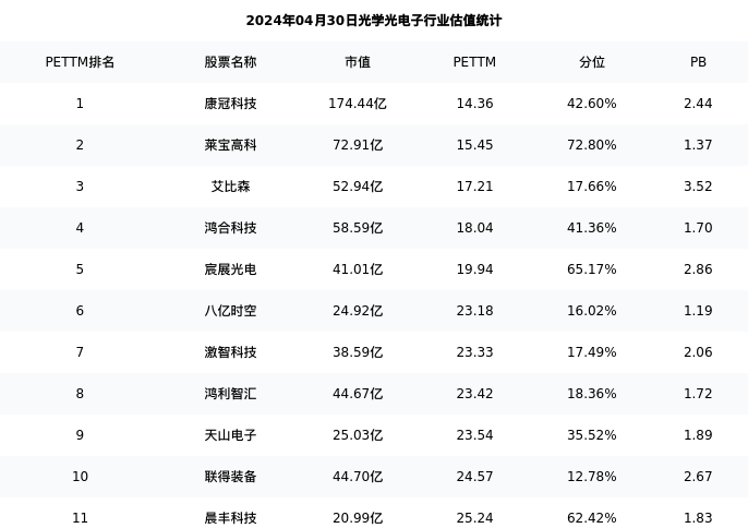 晨丰科技最新报告期数据为一季度,下表汇总了光学光电子行业内市值靠前的公司一季度主要经营数据