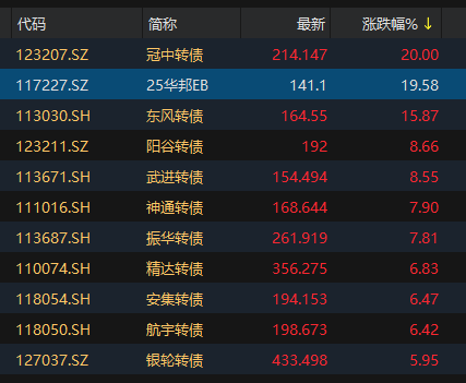 上证报中国证券网讯 10月21日,中证转债指数收涨0.99%,报479.20点。冠中转债涨20%,东风转债涨15.87%,阳谷转债涨8.66%;通光转债跌12.24%,晨丰转债跌7.19%。