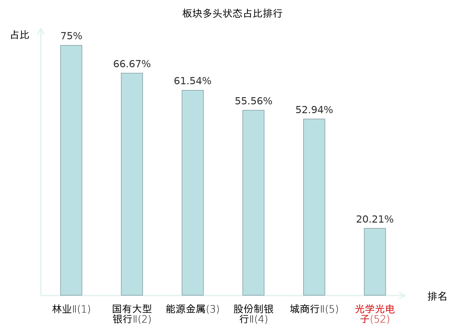 全市场所有行业板块中主力多头状态占比排名中,林业Ⅱ板块位居第一。动物保健Ⅱ板块名次提升最快,较昨日上升82位。