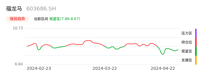 我们来看一下该股的九方特色指标强弱趋势的情况:福龙马自04月15日从持仓区下穿到观望区。股价近期持续下跌后,短期出现止跌迹象。后续重点关注能否再次站上多空分界点:8.67元。如未能有效突破则可能进入新一轮空头行情。