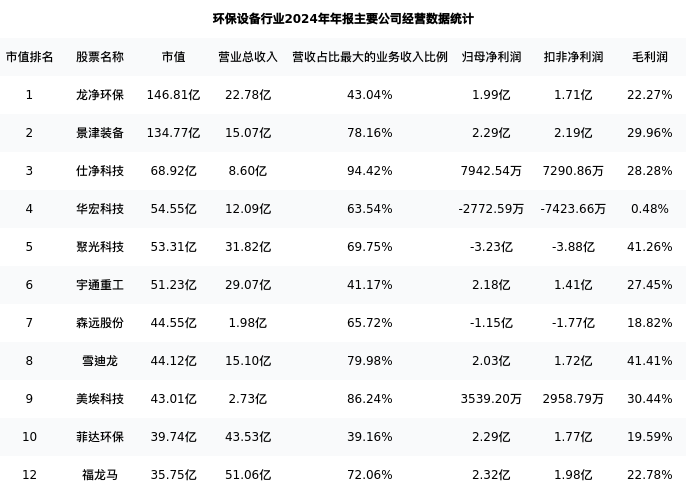福龙马最新报告期数据为年报,下表汇总了环保设备行业内市值靠前的公司年报主要经营数据