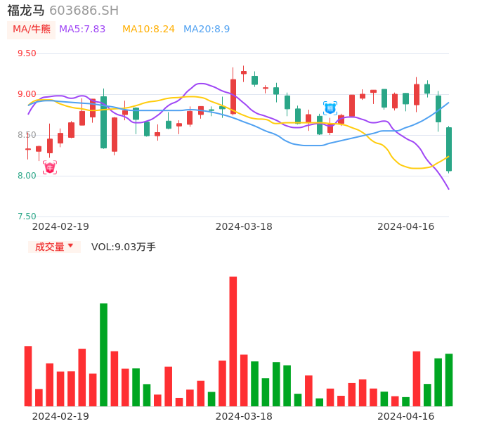04月16日,福龙马收报8.06,股价涨幅-6.93%,成交金额7444.91万元,换手率2.17%。
