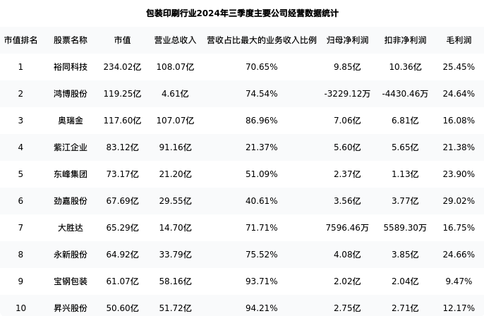 大胜达最新报告期数据为三季度,下表汇总了包装印刷行业内市值靠前的公司三季度主要经营数据