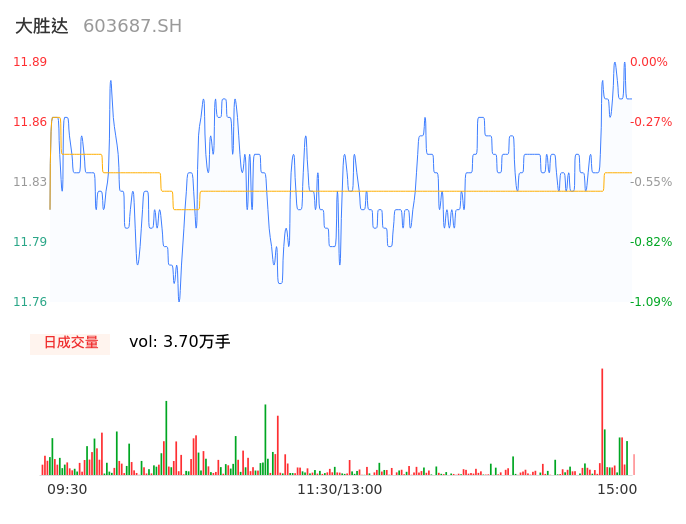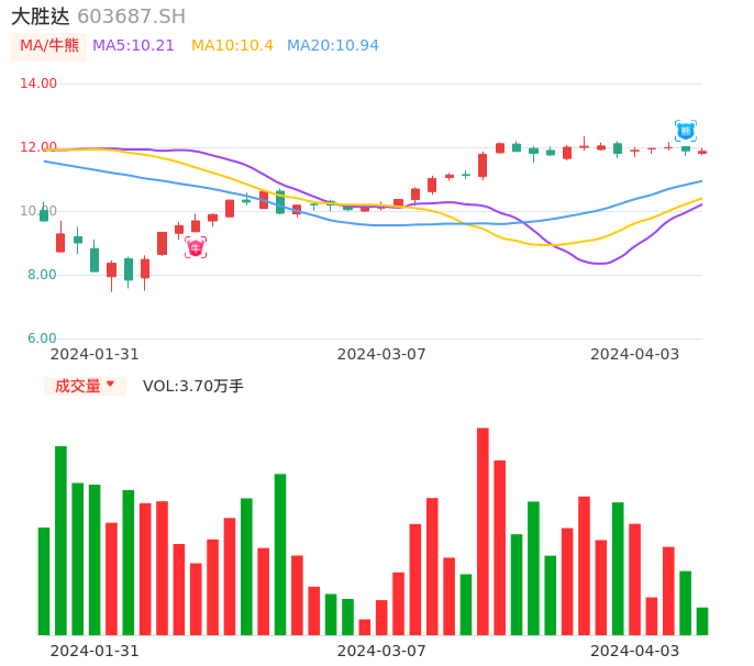 04月03日,大胜达收报11.87,股价涨幅-0.17%,成交金额4375.40万元,换手率0.68%。