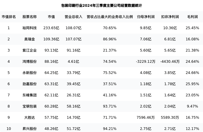 大胜达最新报告期数据为三季度,下表汇总了包装印刷行业内市值靠前的公司三季度主要经营数据