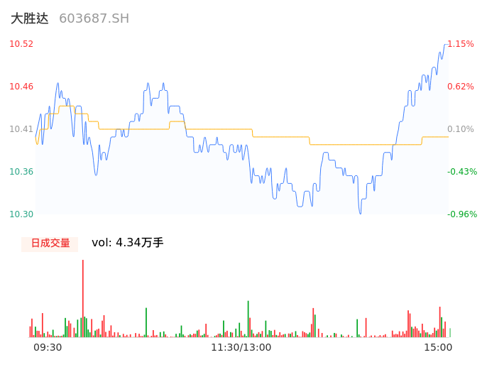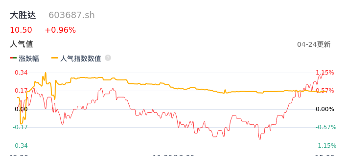 04月24日,大胜达收报10.50,股价涨幅0.96%,成交金额4512.45万元,换手率0.79%。