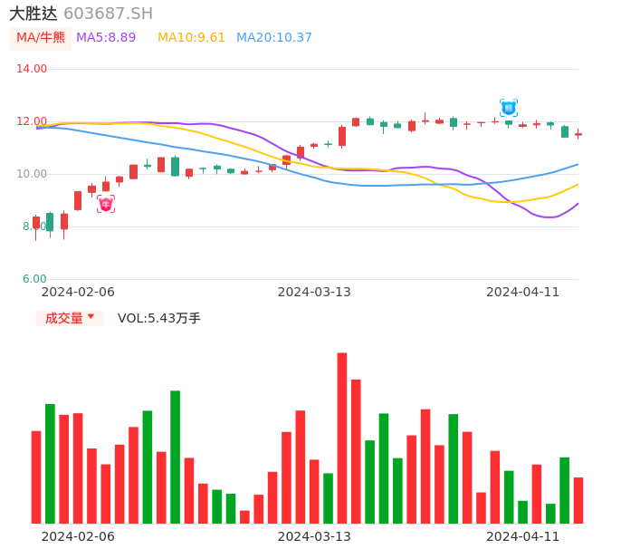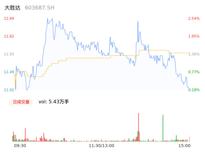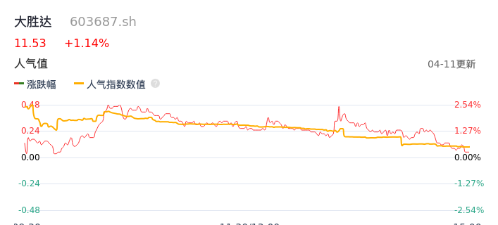 04月11日,大胜达收报11.53,股价涨幅1.14%,成交金额6272.85万元,换手率0.99%。