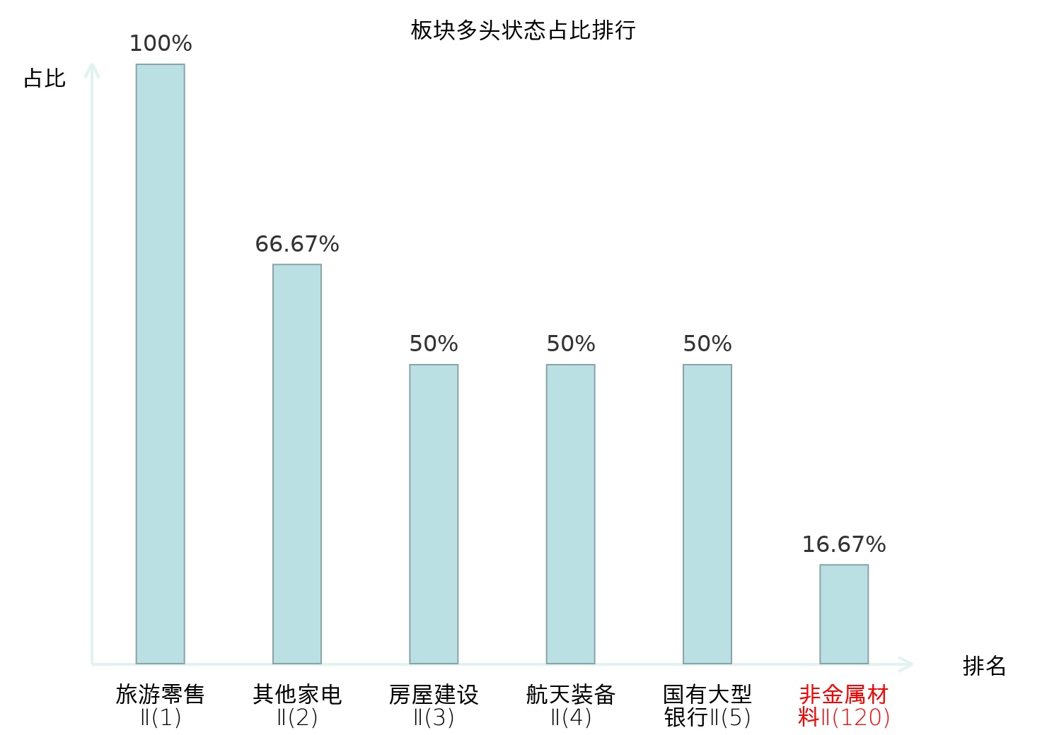 全市场所有行业板块中主力多头状态占比排名中,旅游零售Ⅱ板块位居第一。国有大型银行Ⅱ板块名次提升最快,较昨日上升112位。