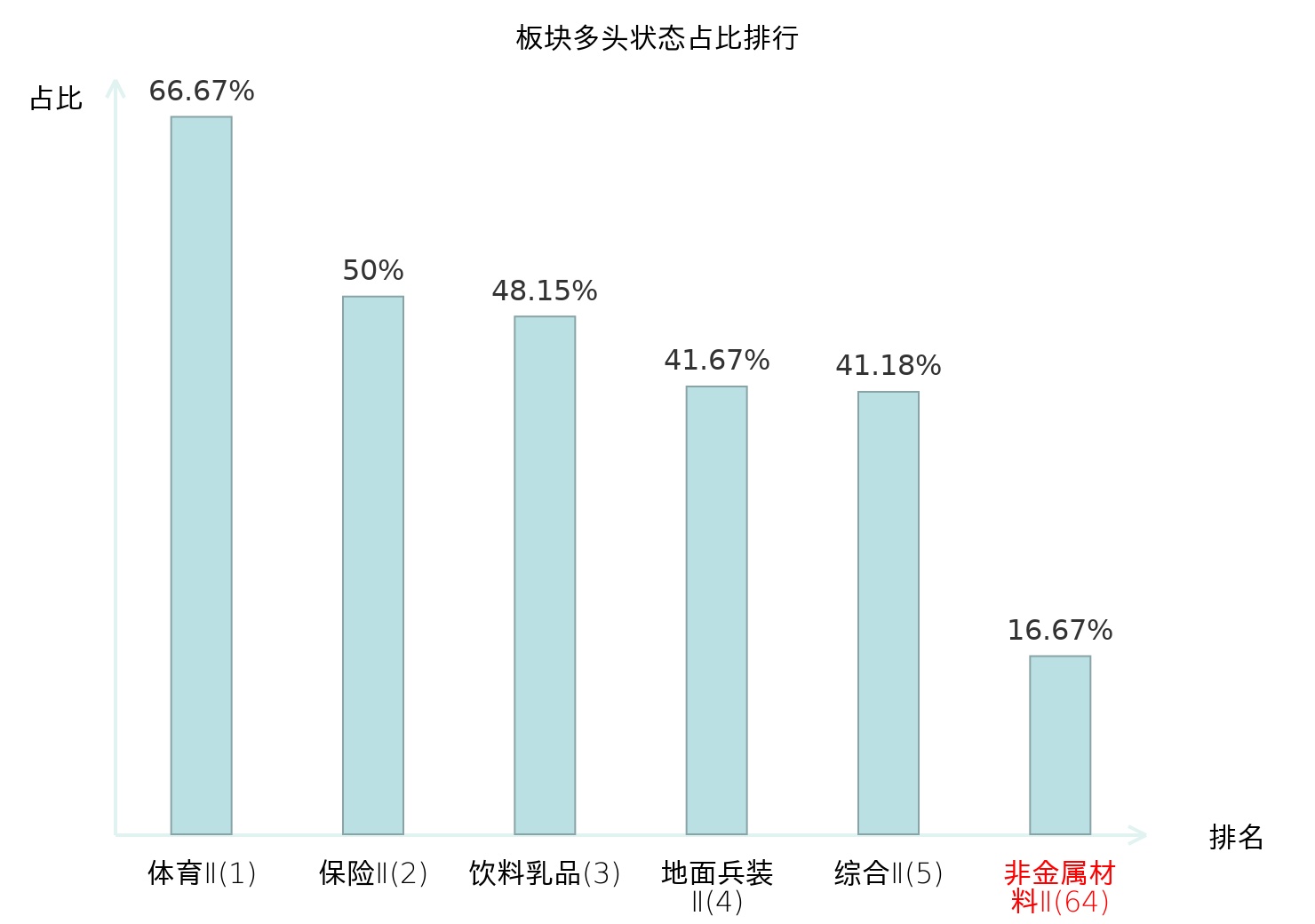 全市场所有行业板块中主力多头状态占比排名中,体育Ⅱ板块位居第一。种植业板块名次提升最快,较昨日上升70位。