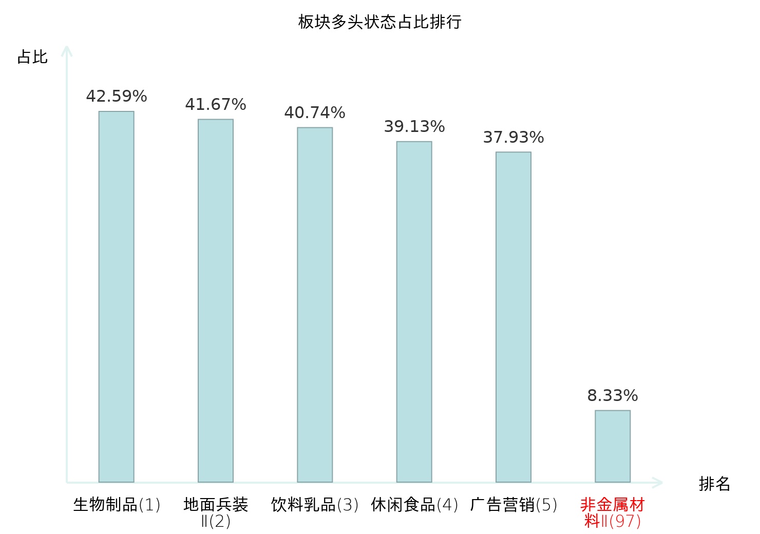全市场所有行业板块中主力多头状态占比排名中,生物制品板块位居第一。黑色家电板块名次提升最快,较昨日上升65位。