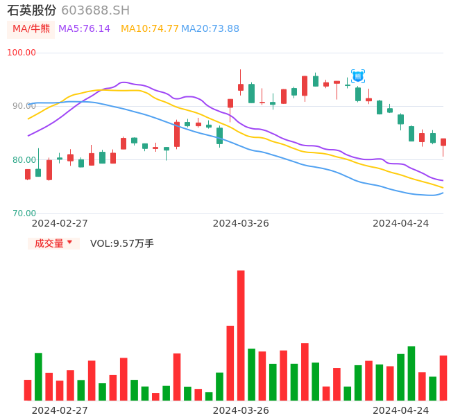04月24日,石英股份收报83.95,股价涨幅0.90%,成交金额7.86亿元,换手率2.65%。