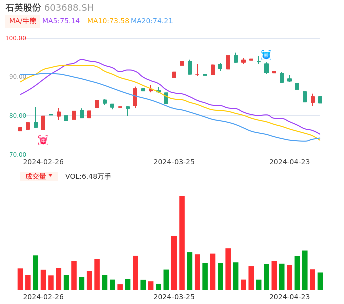 04月23日,石英股份收报83.20,股价涨幅-2.04%,成交金额5.43亿元,换手率1.79%。