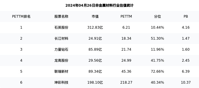 从估值角度看:石英股份最新市盈率PETTM为6.21,在行业内排名1/7,处于10.44分位。