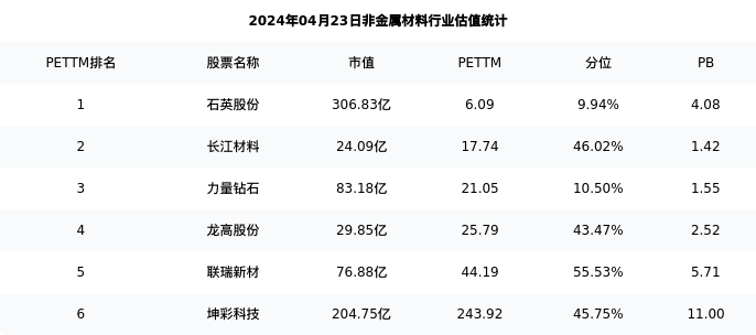 从估值角度看:石英股份最新市盈率PETTM为6.09,在行业内排名1/7,处于9.94分位。