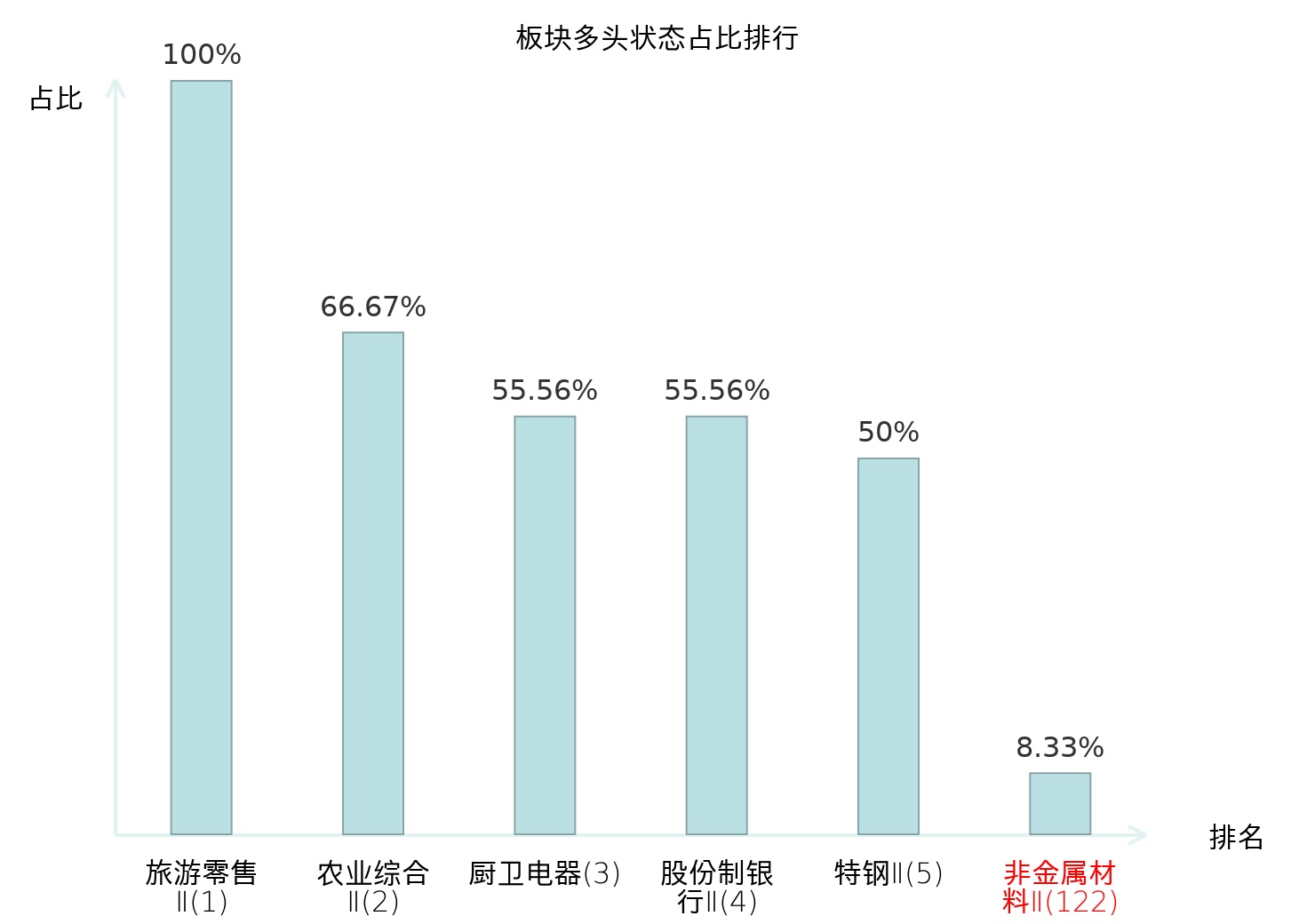 全市场所有行业板块中主力多头状态占比排名中,旅游零售Ⅱ板块位居第一。装修装饰Ⅱ板块名次提升最快,较昨日上升75位。