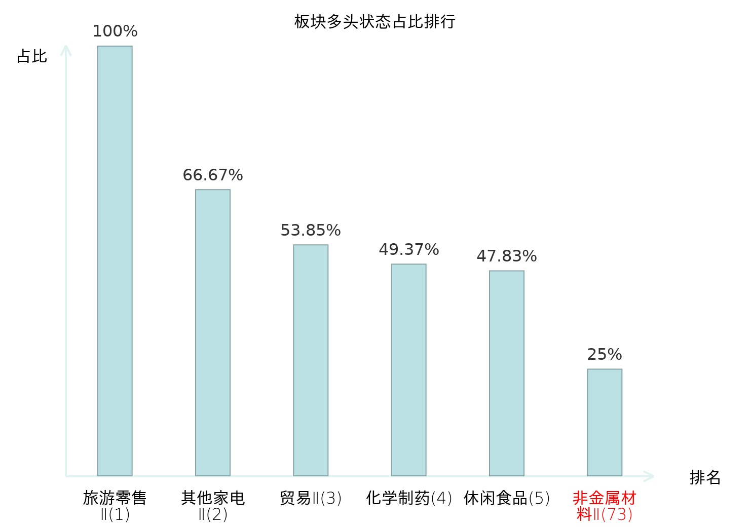 全市场所有行业板块中主力多头状态占比排名中,旅游零售Ⅱ板块位居第一。互联网电商板块名次提升最快,较昨日上升55位。