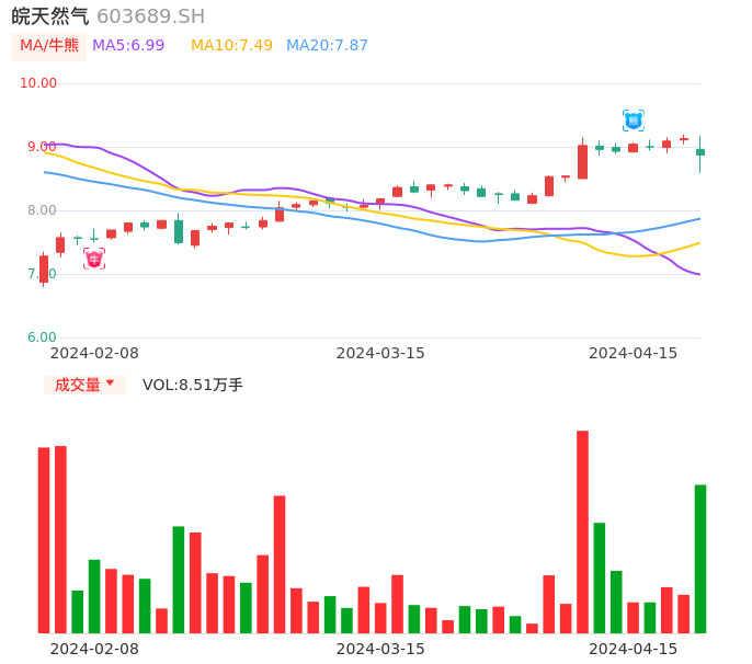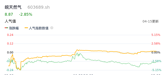 04月15日,皖天然气收报8.87,股价涨幅-2.85%,成交金额7550.11万元,换手率1.81%。