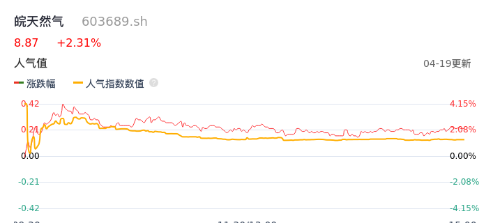 04月19日,皖天然气收报8.87,股价涨幅2.31%,成交金额3862.84万元,换手率0.92%。
