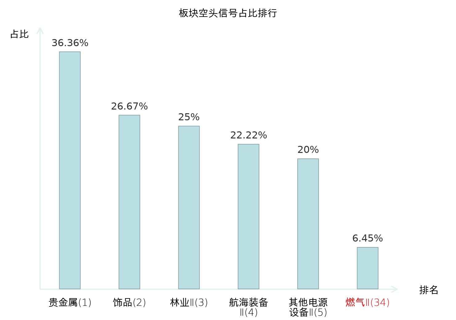 全市场所有行业板块中主力空头信号占比排名中,贵金属板块位居第一。工业金属板块名次提升最快,较昨日上升125位。