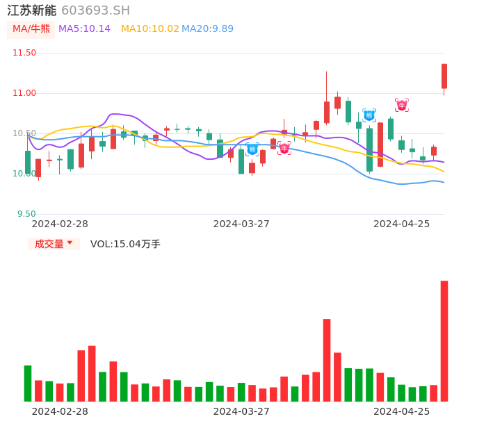 04月25日,江苏新能收报11.36,股价涨幅9.97%,成交金额1.69亿元,换手率1.87%。