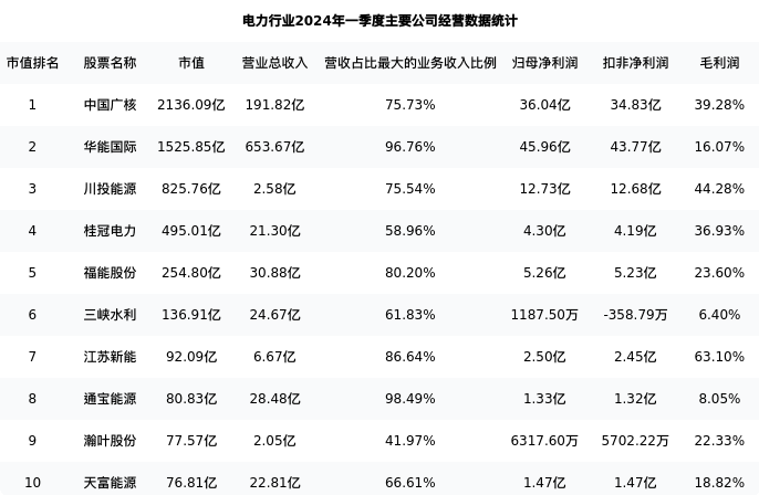 江苏新能最新报告期数据为一季度,下表汇总了电力行业内市值靠前的公司一季度主要经营数据