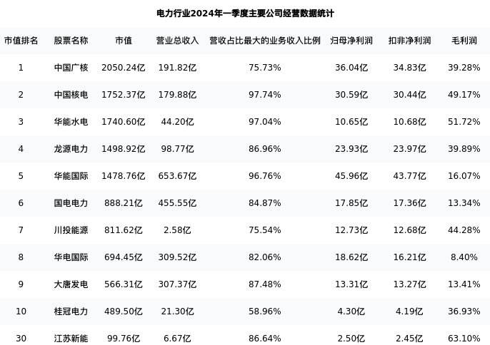 江苏新能最新报告期数据为一季度,下表汇总了电力行业内市值靠前的公司一季度主要经营数据