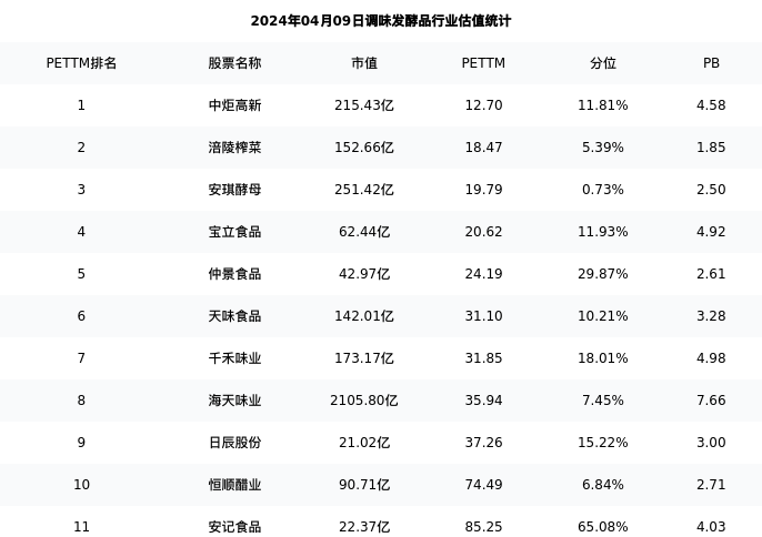 从估值角度看:安记食品最新市盈率PETTM为85.25,在行业内排名11/14,处于65.08分位。