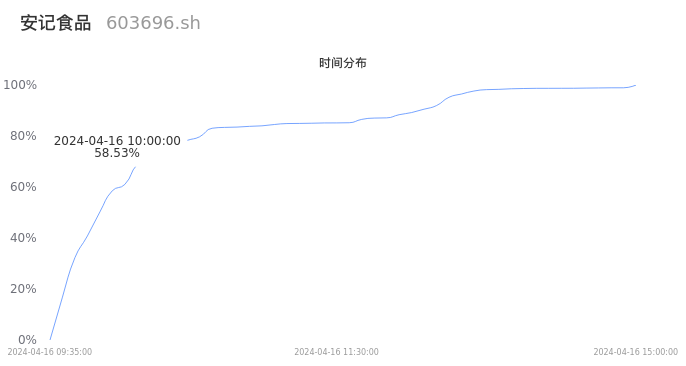 603696安记食品2024年04月16日成交6.39万手,成交金额4885.14万元,相较昨日缩量4.09万手,换手率2.72%,成交清淡。