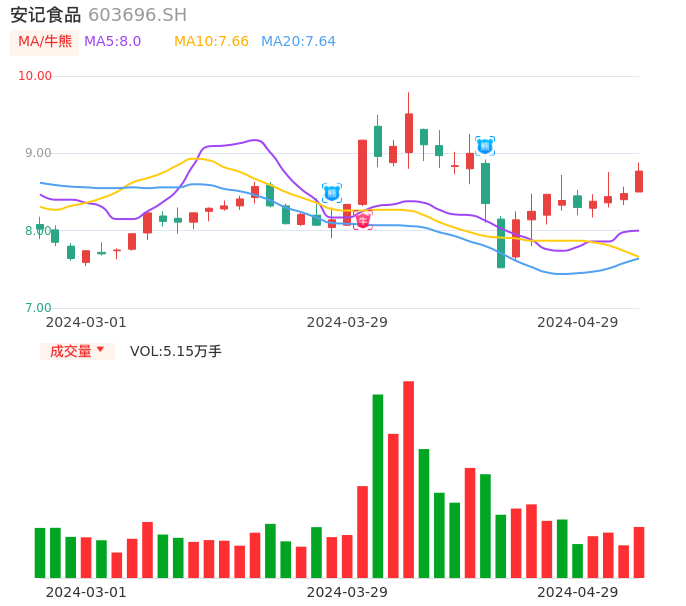 04月29日,安记食品收报8.77,股价涨幅3.42%,成交金额4503.61万元,换手率2.19%。