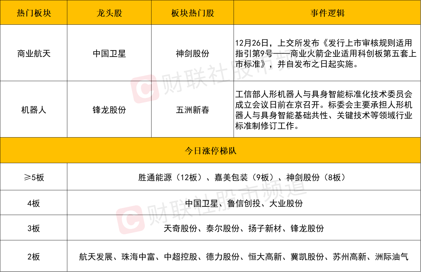 消息面上,12月26日,上交所发布《发行上市审核规则适用指引第9号——商业火箭企业适用科创板第五套上市标准》,并自发布之日起实施。中泰证券认为,未来两年全球有望进入商业航天产业爆发期,技术迭代加速,发射服务、卫星组网等航天任务需求有望加速释放。中国商业航天正跨越由“探索验证”迈向“成长爆发”的关键拐点。
