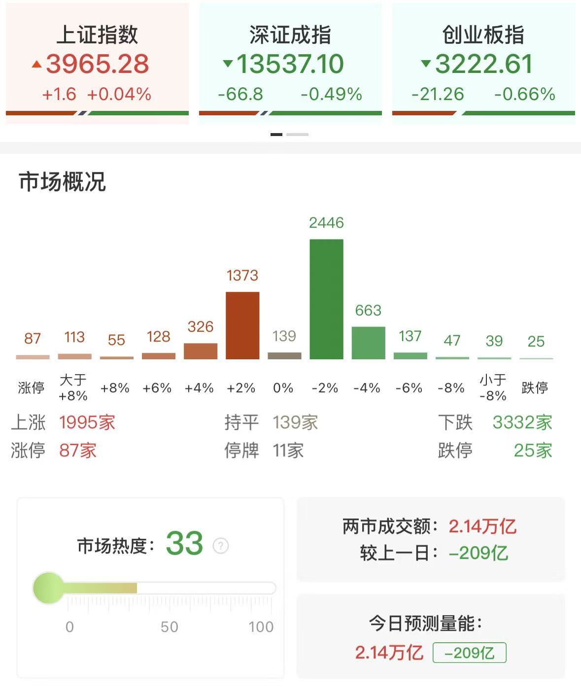 财联社12月29日讯,三大指数涨跌不一,沪指微涨走出九连阳,创业板指一度跌超1%。沪深两市成交额2.14万亿,较上一个交易日缩量209亿。盘面上,全市场超3300只个股下跌。从板块来看,机器人概念午后反复活跃,步科股份20cm涨停创历史新高,五洲新春、模塑科技等多股涨停。商业航天概念延续强势,神剑股份8连板,金风科技、雷科防务等十余股涨停。碳纤维概念表现活跃,吉林化纤、和顺科技双双涨停。下跌方面,电池、乳业、电力等板块跌幅居前。其中电池概念午后震荡下挫,华盛锂电跌超7%。电力板块持续走弱,国电电力跌近8%。截至收盘,沪指涨0.04%,深成指跌0.49%,创业板指跌0.66%。