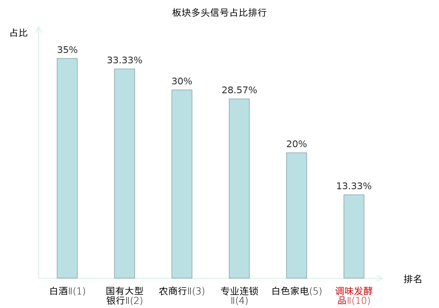全市场所有行业板块中主力多头信号占比排名中,白酒Ⅱ板块位居第一。国有大型银行Ⅱ板块名次提升最快,较昨日上升121位。