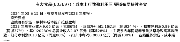 值得注意的是:2024年03月华鑫证券的孙山山分析师,首次发布关于有友食品的研究报告,标题为:有友食品(603697):成本上行致盈利承压 渠道布局持续夯实。
