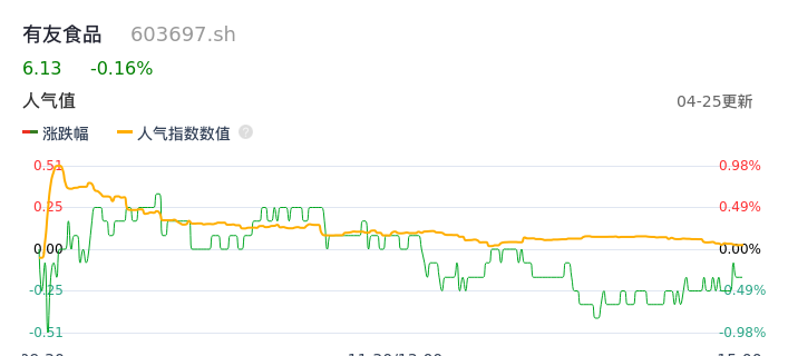 04月25日,有友食品收报6.13,股价涨幅-0.16%,成交金额1590.27万元,换手率0.61%。